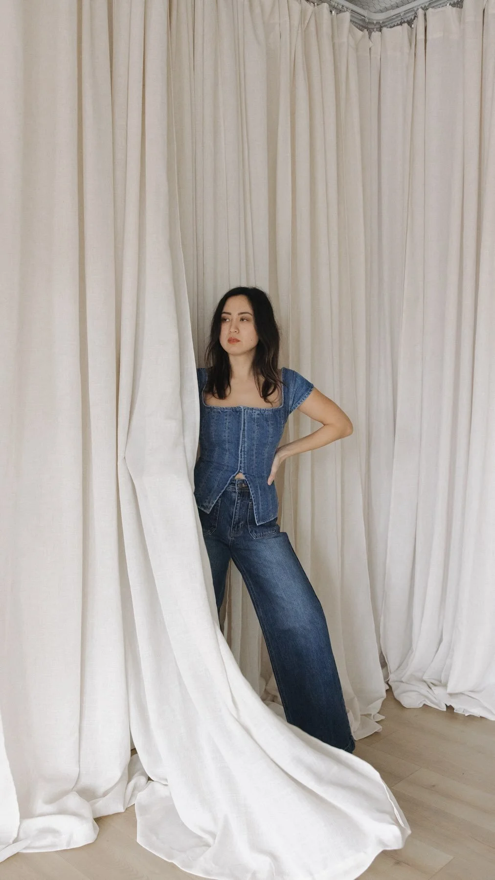 An entire wall of the studio has been dedicated to feature our curated collection of drapery. We raised her to the ceiling and gave her curves. The fabric wall now wraps into a corner—bringing extra height, interest and endless creative potential. The backdrops are mounted on a sliding cable system, allowing you to easily move and arrange them to suit your vision.